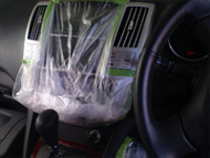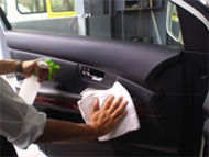 ドアの内側・ガラス内側・ダッシュボード、ハンドル・スイッチまわりなどの硬質面全般を硬質面専用洗剤にて拭きあげます。